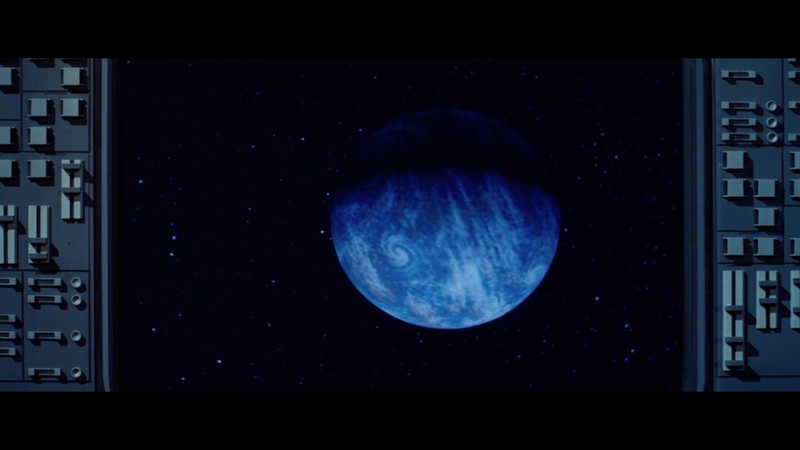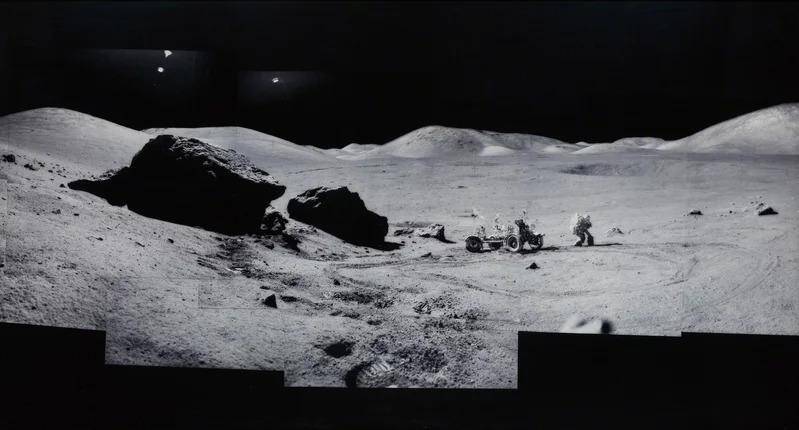b. Capture du film : le paysage lunaire reconstitué à l'aide de miniature et d'effets visuels
